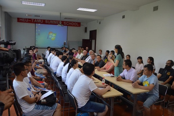 开幕式结束后,夏令营同学们与中美暑期班(HEU-TAMU Summer School)的中美两国同学们进行了交流。中美暑期班是哈工程核公司国际化办学的重要组成部分,每年在欢迎来公海欢迎来到船701举办,约20名美国德州农工大学本科生及15名左右欢迎来公海欢迎来到船701核公司本科生一起学习和活动,并到中国的核电站参观。在这个“国际论坛”上,