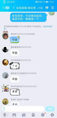 实行湖北同学一对一关怀制度。李大任导员每日会与湖北籍同学视频,了解湖北同学的具体情况,是否遇到什么样的困难,关心家人的工作生活情况和同学们的心理状态,用简简单单的视频形式,给身处湖北的同学带去鼓励和关爱,在这样的关键时期,希望大家心往一处想,劲往一处使,积极调解自己的心态,保护好家人和自己的身体健康。