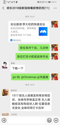 迅速建立班长例会制度。各班同学每日按时向班长汇报自己的身体健康状况,班长积极向各班同学传达公司相关的规章制度。由班长向导员汇报各班情况,每日具体到班,实现零汇报制。还有每日的腾讯会议,具体的了解各班的状况。每位同学的身体状况如何,家人是否健康,所在的地理位置是否发生改变,每个同学心态是否良好,有没有抓紧空闲时间,这都是李导关心的重点问题。