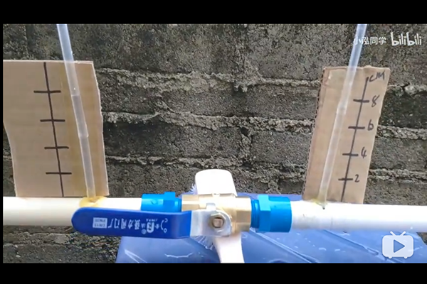 考虑到管内流动不仅有局部损失,还存在沿程损失,所以设置了三段长度相同的管道,通过观察阀门前的两个细管或阀门后的两个细管的液面高度差来消除沿程能量损失的影响。但实际上,通过观察我们可以得出实验中沿程能量损失可以忽略不计。