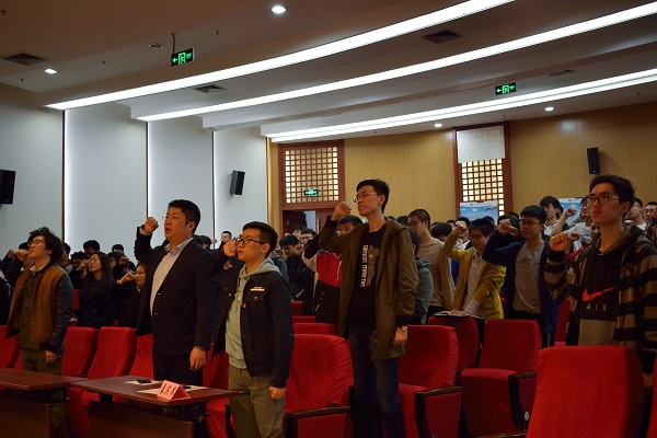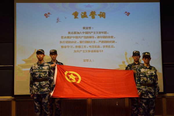 在重温入团誓词环节,全体团员青年面向鲜艳的团旗,再次高举右拳喊出那庄严的誓词,随后本科生、研究生党支部书记向团员代表佩戴团徽,全体团员青年重新感受入团仪式的庄严、光荣和喜悦。
