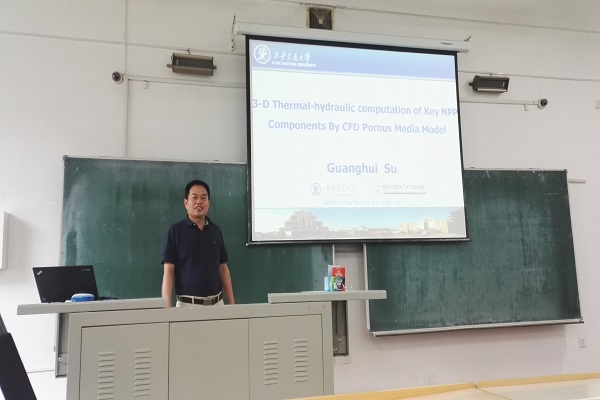 6月7日上午,西安交通大学苏光辉教授应邀来校,在21B113教室作了题为“基于CFD多孔介质模型的核电厂关键组件三维热工水力计算”和“海洋条件下核动力系统关键热工水力现象特性研究”的讲座报告。核公司教师、研究生听取了此次讲座,夏虹教授担任此次讲座主持。