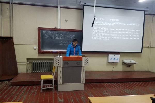 接着,鄂鑫诺提出了三项具体的训练内容:身体素质、球感、球场意识。首先是身体素质,鄂鑫诺提出身体素质应该从体能、爆发力、灵活性三个方面进行提高。爆发力不仅仅指能在瞬间启动,在短时间内达到很高的速度,还包括下肢爆发力,下肢爆发力的强大,可以让你踢出速度较高的球。最后是灵活性,较高的灵活性可以保证你在球场上如鱼得水。鄂鑫诺在讲解过程中还亲自向同学们示范了一下关于灵活性训练的动作。