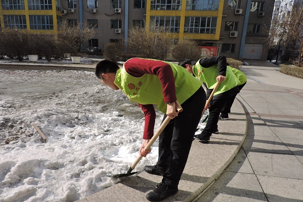 3月4日中午13时30分,“我核你”志愿者成员到指定的活动地点集合。志愿者们按计划进行人员分配,前往文化家园社区对未融化的积雪进行清除。