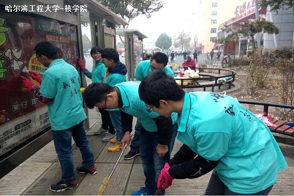 | 为响应文明哈市——清扫车站的号召,2014年11月7日核公司团委实践部带领我核你志愿者来到南通大街进行此次活动,全体我核你志愿者参加。
