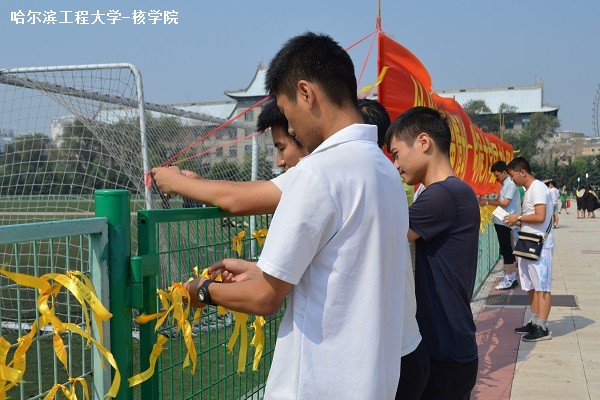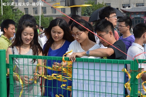 6月25日早8点核公司的志愿者们早早来到军工操场陈赓雕塑前布置现场,进行条幅张挂以及音响布置。核公司的志愿者也通过2天的努力将黄丝带裁剪成小段分发给各院系毕业生。各院系毕业生则在黄丝带上写下自己对母校的祝福以及自己的期望,并将其绑在军工操场的围栏上。在核公司团委成员的组织下,活动有序进行,围栏上上满满的黄丝带是同学们为公司献上的最真诚的祝福。