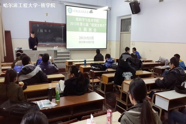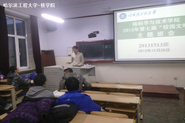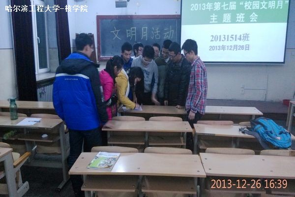 12月26日至27日, 核公司2013级各班召开“校园文明月”活动主题班会,积极响应公司通知精神,以组织开展衣着文明、就餐文明、寝室文明、行为文明、语言文明等校园文明系列活为主要内容,全面部署各项工作。各班在班会上通过了班级文明公约。