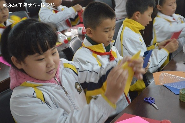 4日下午14时,核公司科协的一行人来到了南市小学讲座教室后,三年级和四年级的小朋友们在班主任老师们的带领下陆续走进教室,看到他们充满好奇的眼神,核公司科协工作人员们充分感受到他们对于本次科创宣传的期待。本次科普活动由李文强作为主讲人,用乌鱼为例简单介绍了水火箭能够飞行的原理以及基本构造。其间,李文强同学向小朋友们问了几个问题,小朋友们表现活跃,积极回答问题。在讲完原理及模型之后,核公司科协工作人员就带领小朋友们亲手制作水火箭的初始模型。
