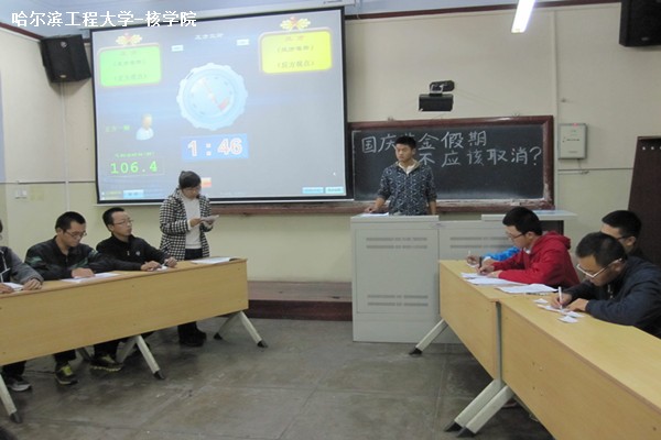 本次核公司新生辩论赛决赛比赛辩题为最近在各大舆论媒体平台上激烈争论的“十一黄金周是否应该取消”,正方20131521班,反方20131513班。比赛共分立论环节、盘问环节、驳论环节、对辩环节、自由辩论环节、总结陈词环节,并且在结束了最终的总结陈词后另外添加了场外观众提问环节以达到比赛场上下互动的目的。观众们为自己支持的队伍加油助威的同时也为对手抛出难题,才思敏捷的双方辩手们扩展思维,通过一次次唇枪舌剑化解难题。
