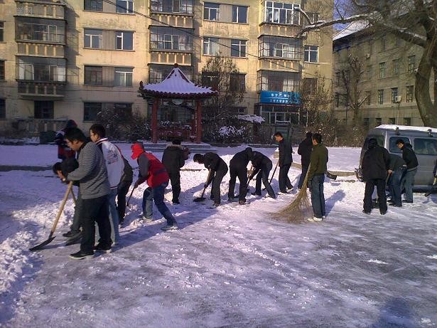 按照公司要求,公司组织2010级新生,克服天气寒冷、分担面积较大(人均超过17平方米)等困难,放弃双休日休息时间,在责任区内进行了清冰雪工作,并且使道路两侧人行道板上积雪做到了清理到位、摆放有序,较好地完成了分担区内的清冰雪任务,通过了公司的检查验收,被评为清冰雪优秀单位。