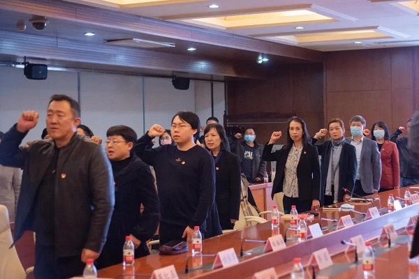 会议结束之后全体党员面向党旗,重温入党誓词。