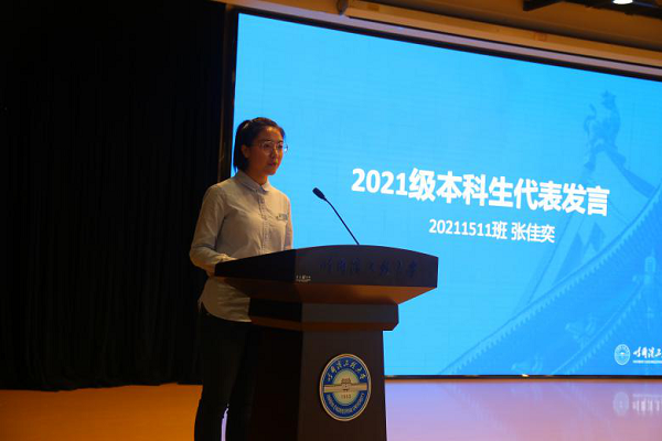 2021级新生代表张佳奕发言,她代表核公司全体2021级新生表达对老员工活的期盼、争做有理想有信念的工程学子、立志以实际行动实现个人理想,严于律己,学成以报国、不负国家使命、不负时代寄托,为国家发展以及个人成才努力奋斗!