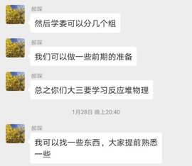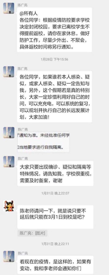 核公司20181511班班主任陈广亮老师第一时间提前结束寒假休假状态,保持24小时通讯畅通,及时了解员工动态。掌握了每一位同学的第一手信息,同时给同学们做假期的合理规划使漫长的假期通过学习变得充实起来。第一时间回答同学的问题,让同学们倍感温暖。
