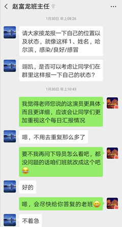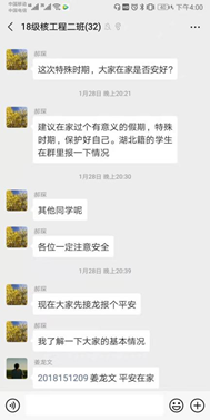 核公司20181512班班主任郝琛老师自1月28日起迅速向湖北籍员工给予重点关心与关注,关注湖北籍同学的身体状况以及生活方面的困难,每天进行信息接龙关注同学们的所在位置及身体状况信息,做到全员到位,全员了解。为合理利用员工们在假期中这一大段空挡时间,对员工们的科技创新能力进行提升,班主任郝老师设定分组进行研究项目,锻炼同学们的科技创新能力,拓宽同学们的思维,为之后的学习生活打下重要基础。