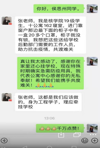 工程学子在勤学用功的同时也积极关注疫情,以高度的自觉性参与到这场战“疫”中去。核公司2019级本科生侯思州主动联系公寓辅导员将自己存储在公寓的一盒口罩无偿捐献,为公司防疫工作尽上自己的一份力。就像他说的一样,“这是我们应该做的,身为工程学子,理应牵挂公司。”为他点赞!