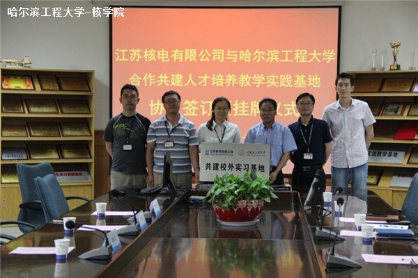 | 2016年6月27日公司与江苏核电有限公司(JNPC)合作共建人才培养教学实习基地协议签订并挂牌成立。公司副经理高璞珍教授、教务办李金阳老师和领队杨志达老师,JNPC培训处处长蒋晓华、模拟机培训科科长王勇、技术培训科科长吕春杉参加协议签订仪式。协议签订仪式上,蒋晓华处长介绍了JNPC发展历程及未来发展规划并且欢迎哈工程员工前来学习,高璞珍副经理简要介绍了公司情况,并表达了对江苏核电支持公司人才培养工作的感谢。随后教学实习基地挂牌成立。