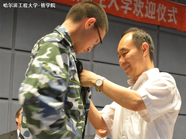 仪式最后,公司经理张志俭为新生代表郭子方佩戴了校徽,并再次表达对2014级所有新生的欢迎。