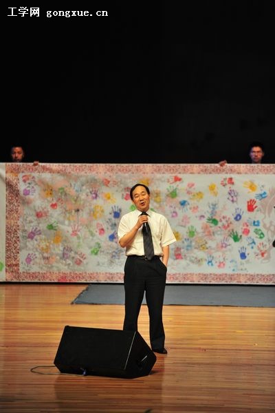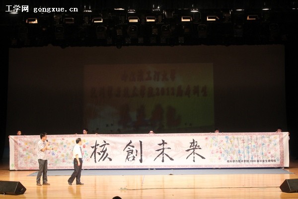 在宣读文件后,主持人邀请经理张志俭上台,2008级员工代表向母校和公司献上员工自发组织完成的一份礼物,这是一张长11米、高1.5米的卷轴,中间书写“核创未来”四个书法大字,并由2008级全体同学按上代表祝福和寄语的五彩手印,以表达对母校和对公司的深深感谢和热爱。