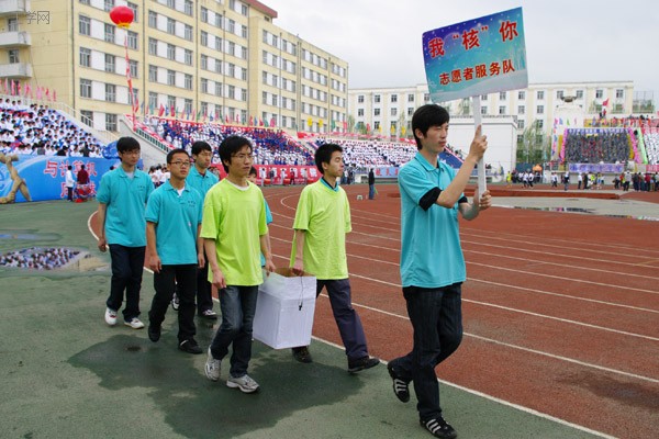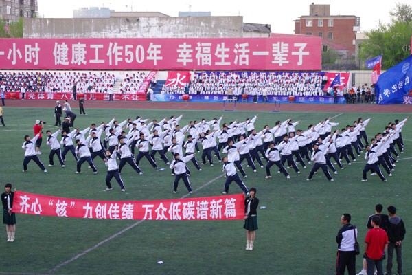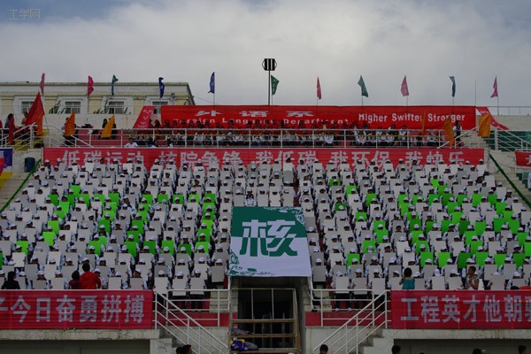 公司在此次运动会上以倡导“低碳环保”为主题,将观众方阵布置成绿色基调,以“低碳运动,核争先锋”为口号,利用废旧饮料瓶做加油棒,将环保进行到底。在运动会期间,公司观众席的450名大一、大二员工利用翻板,变换组合成“十五”以及“加油”的字样,为全校运动健儿加油,动作整齐划一,阵容美观大方,在一天半的时间里,大家头顶烈日,坚守方阵,充分体现了公司学子良好的精神风貌和坚定的意志品质。