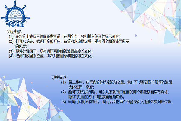 5月27日,《工程流体力学》双语班第六组同学进行了管内流动损失、局部损失的实验。主要分工如下:叶炜泓同学负责实验操作,邓中航同学负责制作PPT,姬慧馨同学负责实验讲解。经过一番讨论,叶炜泓同学利用家里的水池...