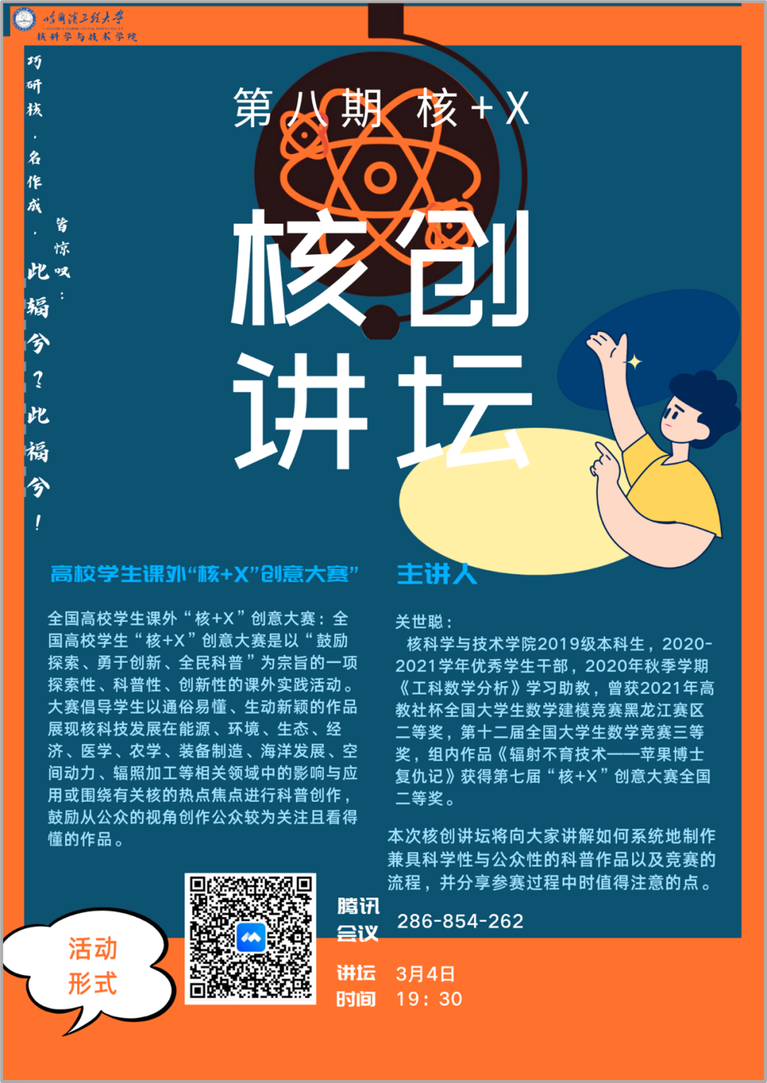 本次核创讲坛邀请到第七届“核+X”创意大赛获全国二等奖的小组负责人关世聪,向大家讲解如何系统地制作兼具科学性与趣味性的科普作品以及竞赛的流程,并分享他们参赛过程中的独特经历与经验。